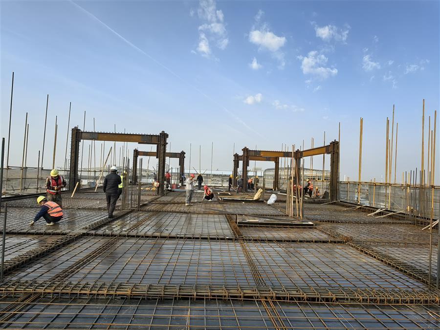 在施工現(xiàn)場,到處可見建筑工人們忙碌的身影,大家分工合作,井然有序地進行病房北樓梁板鋼筋綁扎、水電消防線管預埋、鋼結(jié)構(gòu)吊裝、醫(yī)技區(qū)東段盤扣架搭設、汽車坡道混凝土澆筑等工作面施工,各作業(yè)面協(xié)同推進,現(xiàn)場掀起“大干”熱潮。
