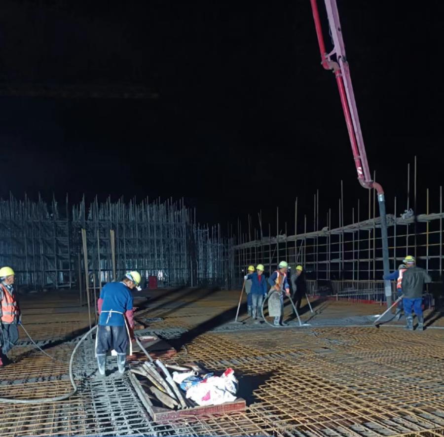 為確保工程快速推進,項目部實行兩班制,科學制定了夜間專項施工方案,倒排工期,規(guī)劃任務單,明確了各施工點的建設內容、時間節(jié)點以及相關責任人,有序推進夜間施工作業(yè)。目前,中試車間一層二次結構砌筑完成;1#、2#生產(chǎn)車間正在搭設49-57軸模架及進行40-45軸剛性地面施工;宿舍樓在進行4層梁板砼澆筑和頂板模板、鋼筋施工;倉庫在進行2層梁板砼澆筑和2層模架搭設。累計完成產(chǎn)值約1.15億元,完成合同造價的23.5%。