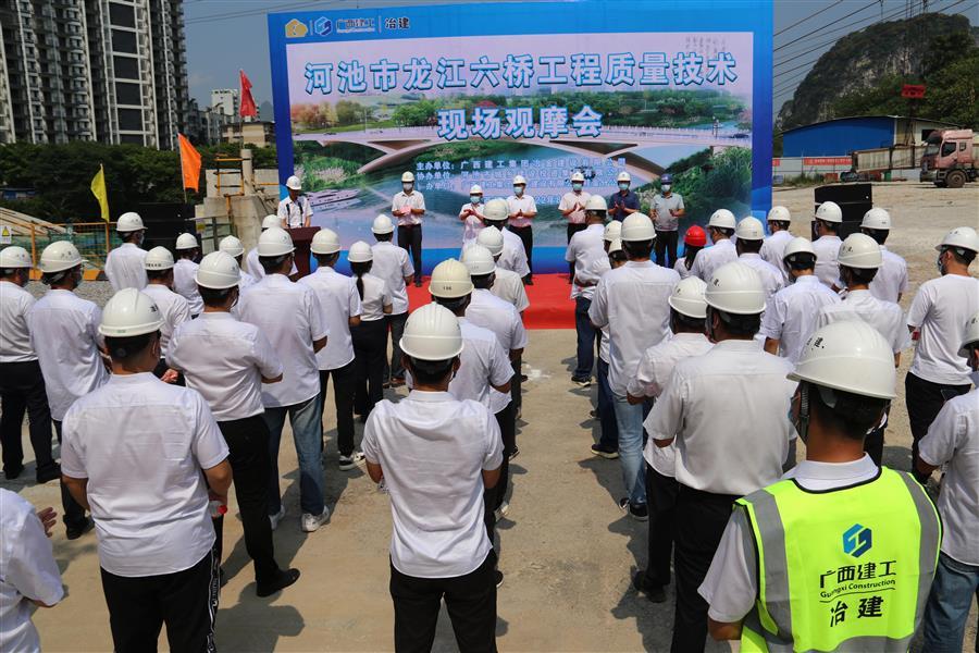 8月1日,冶建公司工程質(zhì)量技術(shù)現(xiàn)場觀摩會在桂金分公司施工的河池市龍江六橋(輝樂橋)工程項目舉行。公司總經(jīng)理、黨委副書記蒙勝益,副總經(jīng)理唐峰,副總經(jīng)理、安全總監(jiān)何勇參加。