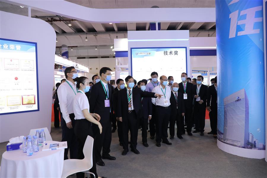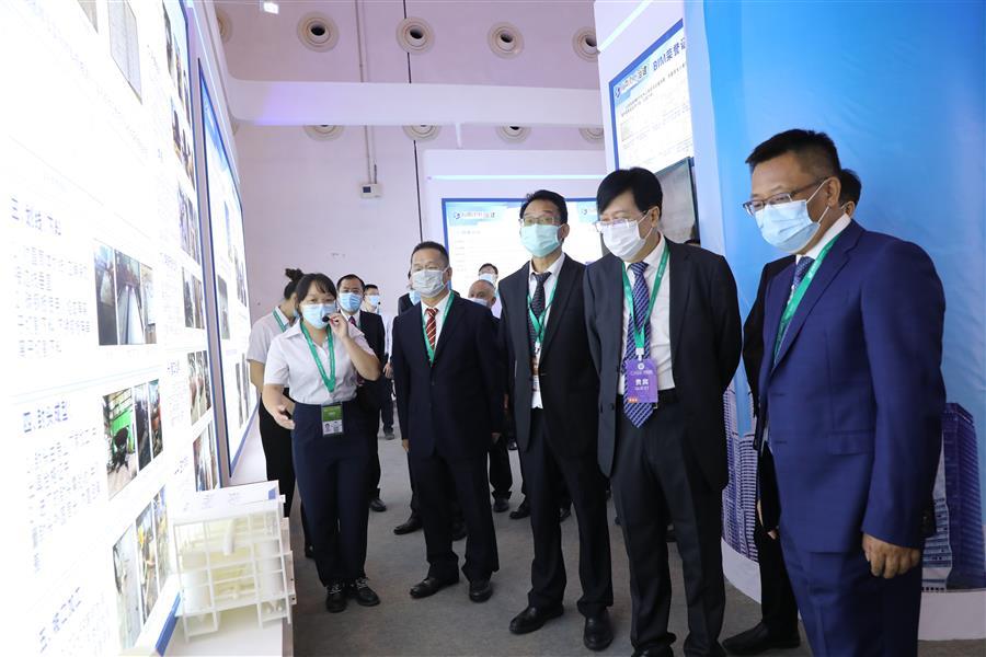 自治區(qū)住房和城鄉(xiāng)建設(shè)廳副廳長(zhǎng)葉云(左二)、潘國(guó)雄(左三)一行到冶建公司展區(qū)參觀